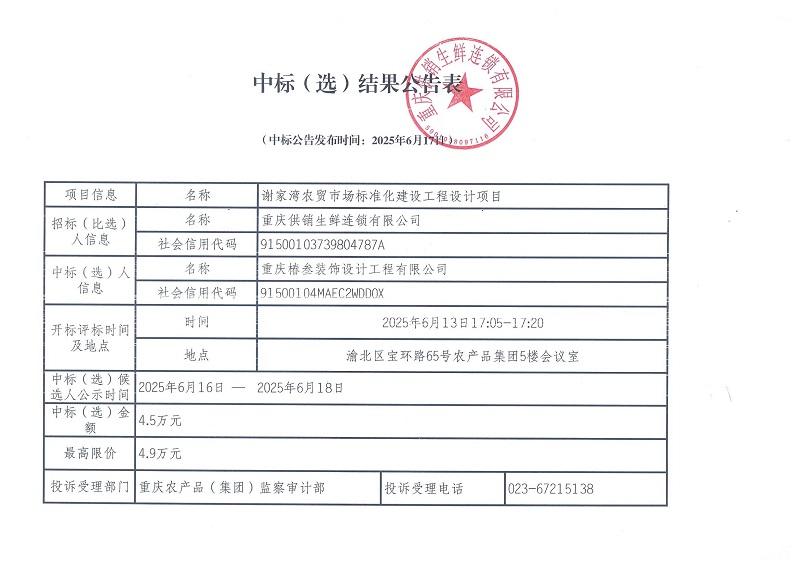 謝家灣農(nóng)貿(mào)市場室內(nèi)裝飾工程招標比選公告1. 招標比選條件重慶供銷生鮮連鎖有限公司謝家灣農(nóng)貿(mào)市場室內(nèi)裝飾工程,招標人為重慶供銷生鮮連鎖有限公司,資金來自業(yè)主自籌資金,...